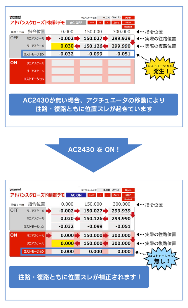 AC2430なら、リニアスケールを使ったクローズドループ制御により、簡単かつ安価に精度改善が可能です。