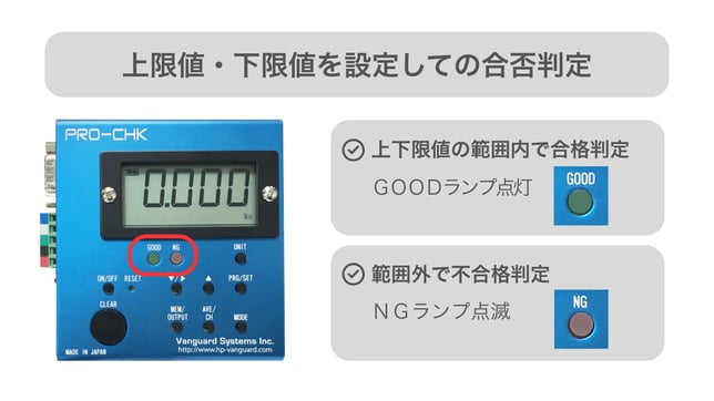 測定値が基準値内か基準値外かを、ランプやブザーで直感的に知らせるため、瞬時の品質チェックを実現し、作業者の負担を軽減しながら高い品質を維持します。