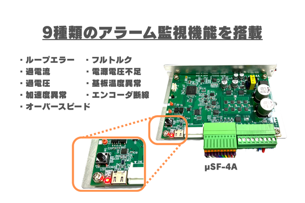 μSF-4Aは、ループエラー、過電流、過電圧、加速度異常など、9種類のアラーム監視機能を搭載。